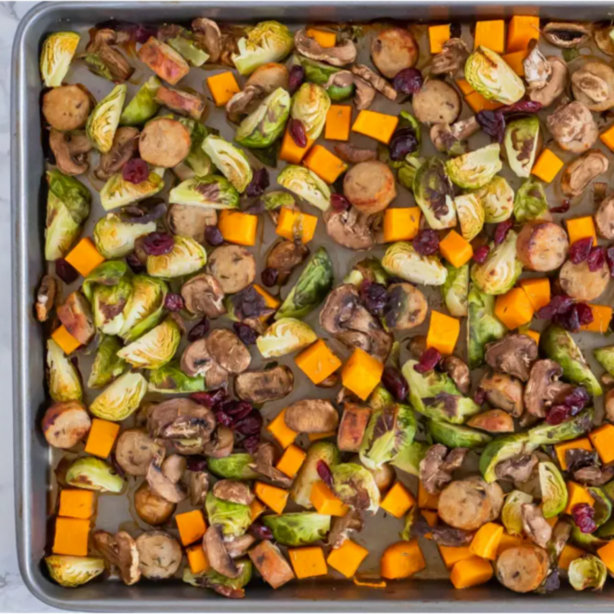 Craving some fall flavors? In this sheet pan dinner, Brussels sprouts, butternut squash and dried cranberries pair perfectly with chicken sausage, all drizzled with a tangy honey mustard dressing.