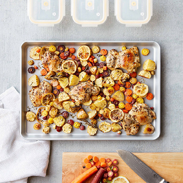Add some zest to dinner with this lemony chicken sheet pan dinner. With simple ingredients, this sweet and savory meal comes together after just 15 minutes of prep.
