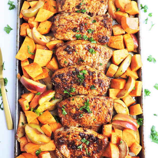 Lean pork chops, sweet potatoes and apples go together perfectly in this complete and balanced sheet pan dinner, with the honey glaze adding a warm sweetness to the dish.